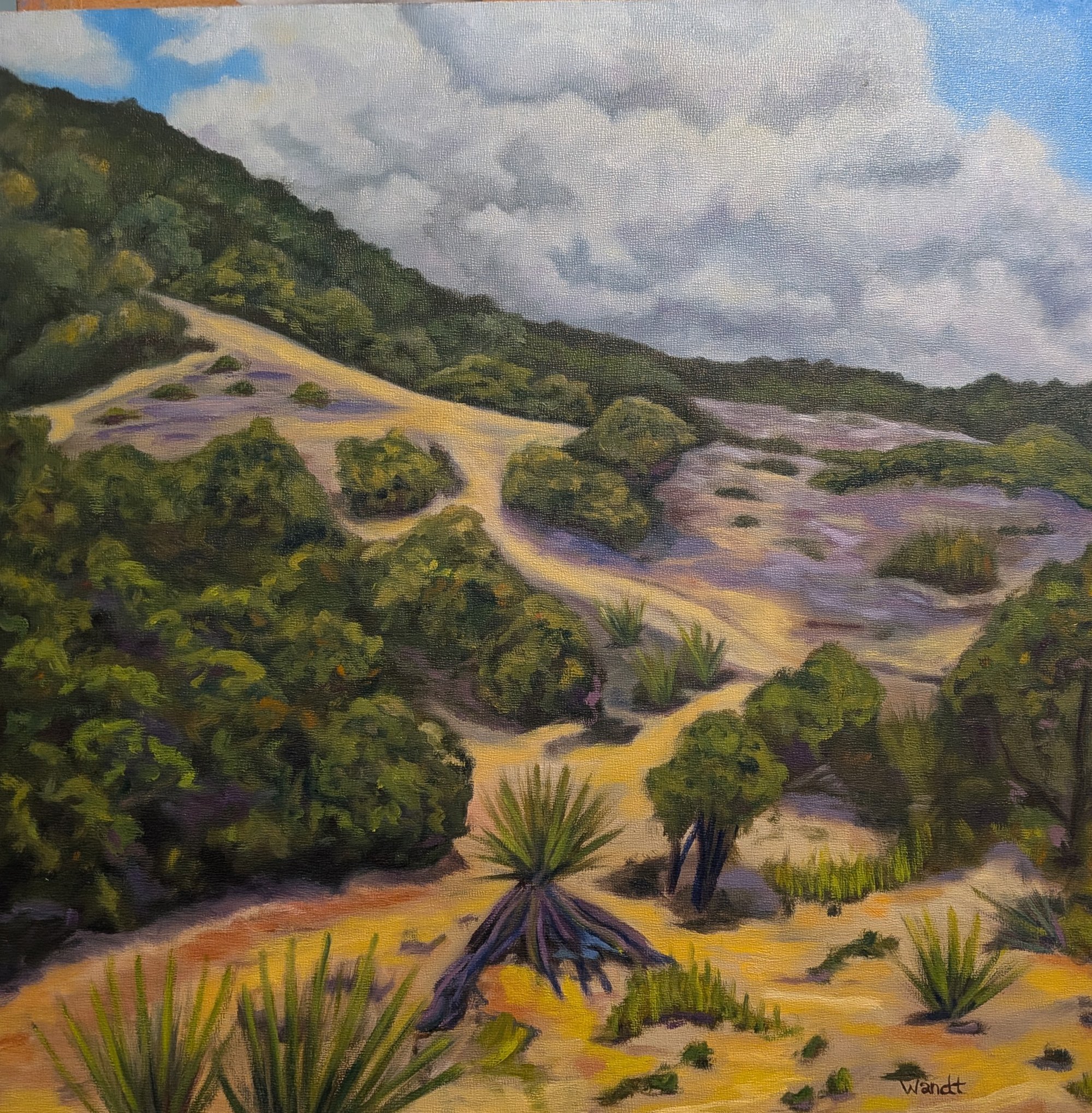 18 x 18'' Oil on Cradled Wood Panel, sides stained warm brown. This location is at Hill Country State Natural Area, a beloved State Park in Central Texas.